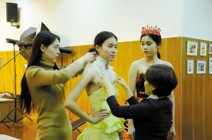 | 韩国全州大学教授朴焕贞在给模特队调整服饰。甬江职高供图 |