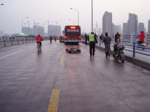 □记者 陈烨 通讯员 朱忠义 昨天,市区最低气温达到-2℃,寒风带来的阴冷,让很多市民直呼“吃不消”,而在鄞县大桥上,结冰的路面更是让司机和骑车人大呼“刹不住”,3辆电动车先后摔倒,公交车避让中紧急制动,也因车轮打滑刹不住,将其中2辆电动车推出去二三十米。所幸,骑电动车的3人均无生命危险。 现场:公交车与2辆电动车发生碰撞 昨天清晨6时20分,鄞州钟公庙交警中队接到报警,在鄞县大桥西往东方向,3辆电动车闯入机动车道行驶,因路面结冰滑倒。其中,2辆电动车被当时正在变道的176路公交车推出去二三十米。 接到报警后,民警迅速赶到现场,看到桥面最右侧车道,公交车左前轮附近倒着2辆电动车,骑车人看上去伤势较重,公交车后方2米开外还倒着一辆电动车,驾驶人受伤较轻。 民警随即通知120急救车前来,大伙儿合力将2名伤势较重的骑车人抬上救护车送院急救,伤势较轻的驾驶人也跟着救护车去了医院。经医生检查,三人均无生命危险。 176路公交车司机姓王,鄞州石碶人。“实在太吓人了!”昨天下午,记者采访了王师傅。回想事发经过,他直言“心都碎了”。他说,当时他正驾驶着176路公交车,沿鄞县大道西往东方向行驶。上桥前,他开着公交车走在中间车道,待开到鄞县大桥中段时,由于前面一辆水泥罐车开得比较慢,就向右打方向准备变到最右侧车道。谁知,意外就在这时发生了。 变道的瞬间,王师傅突然看见前方有电动车滑倒,人摔在地上。为避免发生事故,他赶紧踩刹车,但由于桥面结冰,车轮打滑,一时没刹住,车子继续向前滑行。在滑行时,车子还推着前方倒地的电动车,慢慢开了二三十米后才停下来。“我当时懵了,根本不知道有几辆电动车。”王师傅告诉记者,待他缓过神来后才知道当时有3辆电动车倒地。 原因:洒水车作业导致路面结冰 交警表示,这3辆电动车可能是因为当时机动车道上车辆不多,路面宽敞,就违法开进机动车道里。至于事故的源头———路面结冰是怎么回事,论坛上的网友也十分关注,有网友就直指路面结冰的“罪魁祸首”是洒水车,而公交车王师傅也是这样认为。他说,在事故发生前可能有洒水车经过,冲洗路面时留下了水渍。当时气温较低,又经奉化江上的江风一吹,路面就结冰了。 事实是否如此?记者从鄞州城管局了解到,路面保洁工作是分区块外包给保洁公司的。昨天清晨鄞县大桥是否有洒水车作业?记者联系了负责这块区域保洁的龚经理。 “我们负责的保洁区域是2公里,包括鄞县大桥。”龚经理说,洒水车作业时间是有规定的,气温高于3℃,早晨4点开始作业,气温低于3℃,早晨8点半到9点开始作业。这个规定就是为了避免路面结冰。但在记者与其联系后,龚经理详细了解到的情况却是:昨天早晨5点多,洒水车确实经过了鄞县大桥。 “是我没有跟驾驶员进行充分沟通,是我工作的失误。”龚经理说,接下来一定会把规定好好落实下去。接下来几天气温都比较低,机扫车仍然正常作业,但洒水车会严格根据气温调整作业时间,也会在高峰期避开通行比较繁忙的路段。另外,还会适当减少冬季洒水的次数,保证路面不结冰。 提醒:不要急刹,谨慎驾驶 即便没有洒水车“添乱”,接下来几天司机朋友们也得小心开车。记者从市气象台了解到,受多年罕见强寒潮天气影响,未来几天我市气温持续走低,最低气温在零度以下,路面湿滑容易出现结冰现象,双休日还有严重冰冻。 昨天,市交警局发布了低温冰冻天气的交通出行提醒。低温冰冻天气下,市民应尽量选择公交、地铁等公共交通。驾驶机动车出行前,要做好车辆防滑防冻工作,开车上路,一定要缓慢通行,避免快速超车、随意“加塞”、逆向行驶等不文明交通行为;在经过结冰严重地段时,行车做到“缓加油、轻减速、慢转弯”,尽量不要紧急刹车,以免轮胎打滑。 相关链接 杭州一高架桥因路面结冰致20辆车发生事故 昨天早晨6点多,杭州艮山西路皋塘桥东侧一处高架桥发生多车追尾事故,涉及约20辆私家车,疑与路面结冰导致车辆侧滑有关。据现场一名目击者爆料,当时该高架桥路面结冰,彭埠往杭州方向的私家车与对向车在路口因侧滑相撞。随后,多辆车因刹不住车追尾。 一位追尾的司机说:“路面太滑了,不是水就是冰,前面几辆车一追尾后,我也没刹住车就撞上去了。”当地交警部门了解到,早上该路段发生了多起追尾相撞事故,几起事故加起来大概20辆私家车受损,没有人员伤亡。从杭州市气象台了解到,当时事发地附近最低气温为-1℃左右。