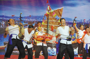 昨晚,在象山县贤庠镇海墩村文化礼堂,2016年宁波市农村文化礼堂“我们的村晚”文艺晚会举行。图为鄞州区古林镇蜃蛟村推出的节目《快乐抲鱼人》,演员平均年龄为70岁。
