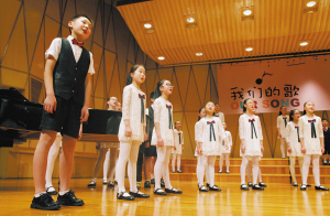 昨晚,宁波音乐厅座无虚席,海曙区学生合唱艺术团专场音乐会———“我们的歌”在这里举行。合唱团的孩子们演唱了《兰亭谣》、《飞来的花瓣》、《让世界充满和平》、《渔歌》等多首中外童声合唱歌曲,让到场的听众享受了一场音乐盛宴。记者 许天长 摄