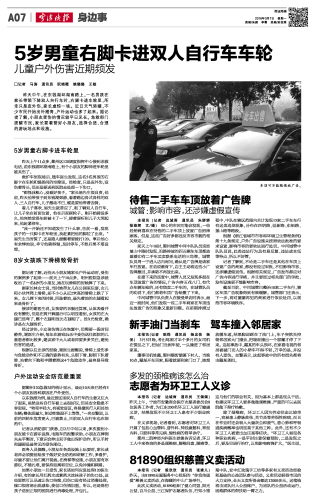 □记者 马涛 通讯员 阮晓薇 姚璐璐 王敏 昨天中午,在东钱湖环湖南路上,一名男孩在家长带领下骑双人自行车时,右脚卡进车轮里,所幸只是皮外伤,家长虚惊一场。近日天气转暖,不少市民开始出外踏青,户外运动也多了起来。据记者了解,小朋友受伤的情况较平日见长。急救部门提醒市民,家长要看管好小朋友,选择合适、合理的游玩地点和设施。 5岁男童右脚卡进车轮里 昨天上午11点多,鄞州区120调度指挥中心接到求救电话,说东钱湖环湖南路上,有个小朋友的脚伸进车轮里被夹伤了。 救护车到现场后,随车医生发现,这名5名男孩的右脚卡在车轮和链条间的空隙里。经检查,只是皮外伤,没伤着骨头,但还是要送到医院去处理一下伤口。 “都怪我粗心,没看好孩子。”家长易先生很自责,他说,昨天他带孩子到东钱湖郊游,看着路边各式各样的双人、三人自行车,儿子激动不已,硬是要他带着去骑。 看儿子喜欢,易先生就答应了,租了辆双人自行车,让儿子坐在前面位置,他在后面踩轮子。刚开始骑没多久,他突然觉得车轮被卡了一下,接着便听到儿子大哭起来,他赶紧停车。 “我一开始还不知道发生了什么事,往前一看,发现孩子的一只脚卡在车轮里,我赶紧把他的脚拉了出来。”易先生当时慌了,还是路人提醒着要拨打120。事后他心有余悸地说,幸亏他骑得慢,及时停车,不然后果不堪设想。 8岁女孩跌下滑梯致骨折 据记者了解,近些天小朋友随家长户外运动时,受伤的案例多了起来———前天上午10点多,明州医院急诊就收治了一名8岁的小朋友,她在玩滑梯的时候摔了下来。 据家长林女士说,当时她带女儿在公园里玩耍,女儿和小伙伴爬上滑梯,却不小心从近2米高的滑梯上跌了下来。女儿摔下来的时候,四肢着地,最先着地的左腿看起来是骨折了。 接诊的谢医生说,女孩穿的衣服还算厚,从体表看并没有擦伤,但是在剪开裤腿后可以明显看到,女孩的左大腿已经弯了,整个左腿明显比右腿短了。经X光检查,确诊是左大腿骨折。 经过诊治,小女孩伤情正在恢复中,但需要一段时间静养。谢医生介绍,每年在游戏玩乐中受伤送往医院的儿童患者都比较多,建议家中大人或老师要多多关注,避免伤害的造成。 根据以往出诊的经验,谢医生提醒说,滑梯上受伤多与危险动作和不正确的姿势有关,头朝下滑、脚朝下趴着滑、站着向下跑和半蹲着滑这4个危险动作,最容易导致骨折。 户外运动安全防范最重要 据鄞州120急救站的统计显示,最近10天来已经有5个小朋友因各种原因在户外受伤。 以东钱湖为例,最近景区里双人自行车的生意又红火了起来,虽然这些自行车看上去很好玩,但其安全隐患不容忽视。“转弯半径大,有视觉盲区,容易撞到行人和其他车辆;整体质量大,制动性能跟不上等等。”一名交警说,以前的四轮车危害更大,已被禁止,目前双人自行车也在规范中。 记者从消防部门获悉,自2月中旬以来,多次接到小朋友被卡在游乐设施、电瓶车的报警求助。小朋友在摔倒失去平衡时,下意识会伸出双手做出保护动作,所以手肘和腿部是最常见的受伤部位。 医务人员提醒,小朋友在各类设施上玩耍时,家长或老师必须提前给孩子做好安全防范和讲解工作,多看护,尽量不要让他们离开视线。在滑梯等设施,小朋友要有序游玩,不能扎堆,要保持距离和空位,以免冲撞和踩踏。 如果小朋友一旦受伤,家长该如何应急处理120医生介绍,有的家长用红药水或紫药水涂抹孩子的伤口处,这些固然可以迅速让伤口结痂,但伤口没有经过消毒处理,痂口很容易出现感染,使创口伤情加重。所以,还是得把孩子送到正规的医院进行消毒处理,并包扎。