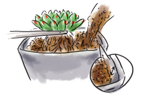 准备土壤的同时还需要准备铺面石,可用粗砂(筛过)、火山岩、风化岩掺杂在一起使用。不要使用那种打磨得特别光亮的白色石子,因为不透气,容易闷坏多肉植物。