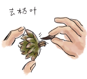 换土同时,要检查多肉植物根系中否有“蚧壳虫”害或者其他病害,如果发现根系或者土壤里有蚧壳虫,可以用药水浸泡根系3-5分钟后再栽种。同时,仔细检查枯叶,因为病虫害都喜欢躲在枯叶下。