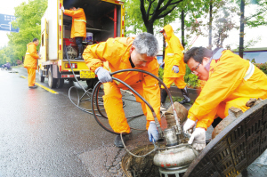 4月21日下午,环城西路北段,市城管局供排水集团排水公司工作人员开展了防汛演练。工作人员快速将强排车水泵拆装到雨水井内,实现快速排水。