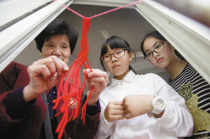 昨日下午,万安社区居家养老服务中心举行立夏节活动,热心的阿姨们手把手教小学生们编织蛋套。