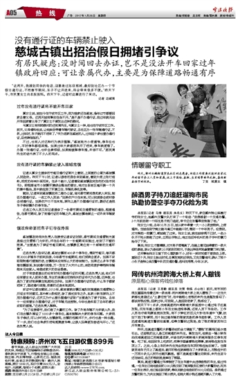 “这两天,我接到同学的电话,说要是过年回慈城,最好到社区办一个节假日通行证,不然春节期间,车子不让开进来,将会带来很多不便。”昨天下午,市民夏女士向本报报料。昨天下午,记者对此事进行了采访。 记者 边城雨 过年没有通行证将不能开车回家 夏女士说,她如今在宁波市区工作,因为娘家还在慈城,逢年过节都要回家去看父母。这两天她有事实在走不开。“是不是不办通行证,我过年就无法开车回家看父母了?”夏女士不禁发出这样的疑问。 与夏女士有相同疑问的还有周先生,与夏女士一样,他也在宁波市区工作。前天,父母通知他说,让他抽空带着车辆行驶证,去社区办一张车辆通行证,不然,过年时,车子就开不进来了。“作为老家在慈城的人,过年回个家也要办通行证,总觉得怪怪的。” 不过,也有人对这种行为表示理解,“慈城地方小街道窄,停车位也少,平时停车都很困难。如果过年大家都把车开了进来,停车就更难了。办理一张通行证,也许会麻烦些,如果能缓解停车难,未尝不可。”居民周先生的话代表了不少人的观点。 没有通行证的车辆禁止驶入慈城古镇 记者从夏女士提供的节假日通行证照片上看到,上面盖的公章为慈城镇人民政府。昨天下午3时,记者以游客的身份来到慈城,看到大街上张灯结彩,浓浓的年味扑面而来。在多个路口,记者看到慈城镇政府发布的《告市民书》, 称根据省市小城镇环境综合整治的要求,将对古县城区域开展一个月的集中整治,其中就包括了环境卫生、车辆乱停乱放等。 随后,记者来到慈城镇政府二楼办公室,询问春节期间想和家人来玩,能否办理通行证。一名工作人员说:“如果你户口在本地,可以到居委会或村委会领通行证。如果你户口不在本地,原则上是不办理通行证的,最好还是把车子停到镇外的停车场。” 这名工作人员又向记者提供了一份春节期间交通管制的通告,根据通告,在春节期间,除了有通行证的车辆之外,慈城古镇将禁止一切外来车辆驶入。 镇政府称要把车子引导在外围 慈城镇政府相关负责人在接受记者采访时称,春节期间交通管制方案是经过交管部门允许的,并在去年的十一长假期间实施过,收到了不错的效果。“主要是为了保证节假日期间,古镇景区周边有一个顺畅的交通环境”。 这名负责人告诉记者,慈城古镇有400多个停车位,遇到节假日,每天都有3000多辆车子前来旅游,今年春节长假期间,他们预测会更多。如果不采取限制通行措施的话,古镇根本没有那么大的容纳能力。如果这么多车子都堵在镇里面,别说通行困难,万一发生了火灾什么的,消防和救护等特种车辆根本无法驶入,将造成较大的安全隐患。 对于有读者提出的没有时间办理通行证的问题,这名负责人说,他们并没有要求本人前来办理,车主的亲属也可持相关的证件代为办理,这样做,也是为了更好地保障当地居民过好年。如果不办理通行证的话,什么车子都驶进来了,造成通行困难,受害的还是本地居民。 采访中记者注意到,2013年,慈城曾就古镇区域拟实施道路交通管制公开征求市民意见,其中第9条规定,除了厢式货车之外,私家小轿车原则上不用办理通行证,这次又为什么要办理通行证呢?“主要是为了便于识别。去年十一没有要求办理通行证,对于车辆无法控制,今年也是吸取了去年的教训采取的措施。”这名负责人解释。 “为了迎接春节,我们做了大量的工作。除了外地车辆不允许驶入外,我们在古镇外围设了1000多个停车位,基本能解决大家的停车问题。大家把车子停好,可以步行进入古镇参观,古镇的范围并不大,步行也是一种乐趣。下一步,我们也会考虑引进电瓶摆渡车等,让游人玩得更加舒适与开心。”这名负责人说。