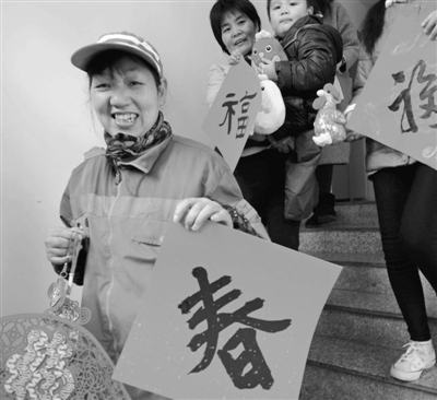 昨天,鄞州白鹤街道贺丞社区的志愿者,向因工作需要不能回老家过年的留守务工人员和家属,送上中国结、春联、生肖鸡等新年礼物,喜迎新春佳节的到来。 丁安 陆雯文 摄