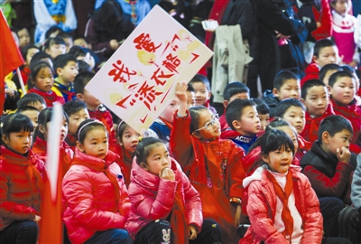 在昨天举行的鄞州第二实验小学开学式上,一些学生身穿以往在校园活动中使用过的服装来了一场“时装发布会”,该校促进学生二手礼服循环利用的“添衣格”平台也正式投入运作。图为孩子们在观看同学“走秀”。记者 刘波 摄