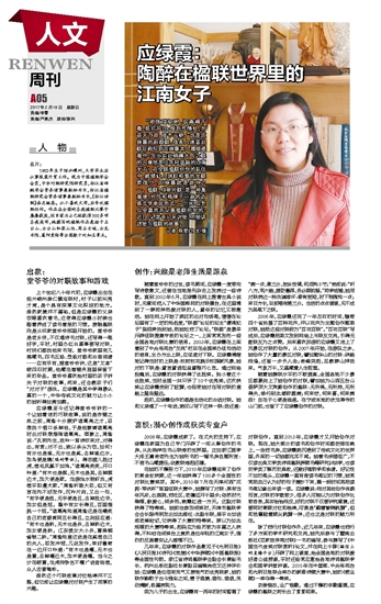 “顽临顶极时,驭青嶂千尊,阻拦风过;阔到性情处,划苍天万亩,借予云耕。”这是应绿霞的自题联,很多人读罢此联后再见到应绿霞本人都颇感意外:写出如此磅礴大气之联的人竟然是位年轻温婉的江南女子!在全国楹联创作的队伍中,能够让人刮目相看的女联家很少,应绿霞就是其中之一。楹联,俗称对联,是一种集意境、对仗和格律于一身的古典文学表现形式,一个80后怎么会喜欢并从事楹联创作的?近日,记者专门采访她,听她讲述她与楹联的故事。 记者 陈爱红 文/摄 人 物 名片: 1982年生于绍兴嵊州,大学毕业后从事服装外贸工作。现为中国楹联学会会员,中华对联研究院研究员,浙江省辞赋学会常务理事兼副秘书长,浙江省楹联研究会常务理事兼副秘书长,《浙江诗联》杂志编委。从小喜欢文学,后专攻楹联创作。作品在全国的各类楹联比赛中屡屡获奖,到目前为止已经获得300多项各类奖项,她撰写的楹联作品悬挂于五台山、云台山和梁山泊、商丘古城、云龙书院、嵩阳里街等全国数十处知名景点。 启蒙: 堂爷爷的对联故事和游戏 上个世纪八十年代初,应绿霞出生在绍兴嵊州崇仁镇迎联村,村子以前叫秀才湾,是个具有深厚文化积淀的地方。虽然家境并不富裕,但是应绿霞的父亲农暇喜欢看书,这使得应绿霞小时候也跟着养成了读书看报的习惯。接触楹联则是从邻家堂爷爷那里开始的。堂爷爷是老乡贤,不仅通诗书对联,还写得一笔好字,平时,村里办红白喜事要写对联,村民们都找他来书写。堂爷爷家里有几箱藏书,四书五经、笠翁对韵和白香词谱……应有尽有,据堂爷爷讲,这是“文革”破四旧时期,他藏在墙壁夹层里保留下来的珍品。堂爷爷喜欢给村里的孩子讲关于对联的故事,闲来,还会教孩子们“对对子”游戏。应绿霞是其中学得最认真的一个,中华传统文化的魅力让小小的她听得如痴如醉。 应绿霞至今还记得堂爷爷讲的一个让她着迷的巧联故事,说的是赤壁之战之前,周瑜十分嫉妒诸葛亮之才,总想找个借口杀掉他,于是他宴请诸葛亮时出对联想难倒诸葛亮。酒宴上,周瑜说:“孔明先生,我吟一首诗你来对,对得出,有赏;对不出,就以杀头为罚,如何?有水也是溪,无水也是奚,去掉溪边水,加鸟便是鶏(鸡的繁体)。得志猫儿胜过虎,落毛凤凰不如鸡。”诸葛亮笑笑,开口吟道:“有木也是棋,无木也是其,去掉棋边木,加欠便是欺。龙游浅水被虾戏,虎落平阳遭犬欺。”周瑜听罢大怒,但又有言在先不好发作,沉吟片刻,又出一句,“有手便是扭,无手便是丑,去掉扭边手,加女但是妞。隆中有女长得丑,百里难挑一个妞。”诸葛亮知道周瑜这是在嘲笑自己的老婆黄阿丑长得丑,立刻回应道:“有木也是桥,无木也是乔,去掉桥边木,加女便是娇。江东美女大小乔,曹操铜雀锁二娇。”周瑜知道这话是在奚落自己的夫人,怒发冲冠,几欲发作,幸好鲁肃在一边开口吟道:“有木也是槽,无木也是曹,去掉槽边木,加米便是糟。当今之计在破曹,龙虎相争岂不糟?”话音刚落,众人击掌喝彩。 虽然这个巧联故事对仗格律并不工整,但它却让应绿霞对对联产生了浓厚的兴趣。 创作:兴趣是老师生活是源泉 随着堂爷爷的过世,读书期间,应绿霞一度转向写诗歌散文,还曾在当地报刊杂志上发表过一些诗歌。直到2002年6月,应绿霞在网上搜看古典小说时,无意间进入了中华国粹网的对联擂台,在这里遇到了一群同样热爱对联的人,童年的记忆又被激活。她在网上开始了疯狂的出对句练笔,慢慢在论坛里有了一定的知名度。“联都”论坛的坛主“潇湘妃子”陈丽荣找到她,把她拉进了论坛。“联都”是最早开辟征联搜集专版的论坛之一,上面常常发布一些全国各地对联比赛的信息。2003年,应绿霞在上面看到了中央电视台“交流”栏目在全国举办征句活动的信息,主办方出上联,应征者对下联。应绿霞清楚地记得当时的上联是:校树校花展示校园新风景,她对的下联是:童言童语坦呈童稚巧心思。通过网络投稿后,应绿霞的对联获得了优胜奖。别小看这个优胜奖,当时全国一共只评了10个优秀奖,这次获奖让应绿霞受到了鼓舞,也促使她对在写对联的道路上越走越远。 起初,应绿霞创作的都是生活化的白话对联。她和父亲通了一个电话,就可以写下这样一联:我还道:“痴一点,傻三分,放纵性情,何须拘小节;”爸却说:“听八方,观六路,提防鲁莽,务必顾前程。”同学结婚,她用对联表达一种戏谑感怀:春宵苦短,时下稍微知一点;来日方长,目前唯有羡三分。生活的点点滴滴,无不成为其笔下之联。 2006年,应绿霞还花了一年左右的时间,辗转四个省拍摄了百种花卉,并以花卉为主题创作题图对联,她把这些对联称为“百花百联”。“百花百联”写成后,应绿霞把图文发到网络上与联友交流,引得无数联友为之点赞。后来喜欢旅游的应绿霞又迷上了风景区对联的创作。从2007年开始,在游玩之余,她创作了大量的景区对联,譬如题华山的对联:狭路相逢,还留一步予人走;奇峰突起,且教群山拜我来。气象万千,又蕴藏着人生哲理。 随着她撰联水平的不断提高,全国各地不少景区都篆刻上了她创作的对联,譬如她为山西五台山菩萨顶大文殊殿创作的楹联:无所畏,无所持,无所得失,修行到此堪称圆满;何来悲,何来喜,何来痴怨?自在于心便是逍遥。在宁波本地的伏龙禅寺的山门前,也留下了应绿霞创作的对联。 喜悦:潜心创作成获奖专业户 2008