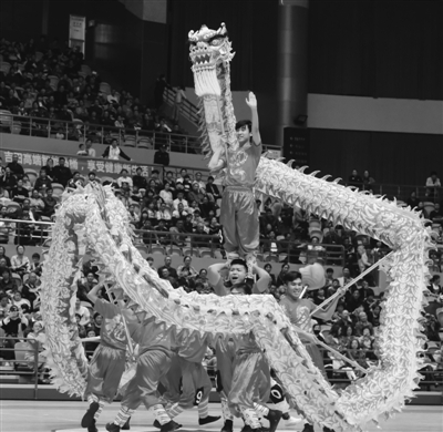 图为中国香港北少林门龙子祥国术总会舞龙队在比赛中。