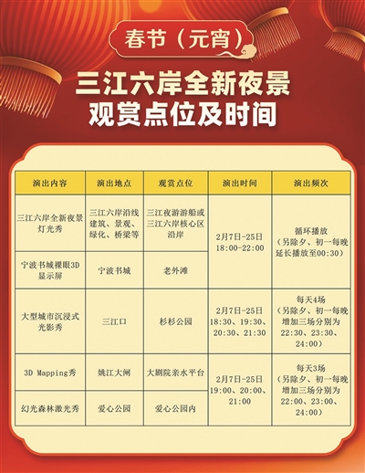 “宁波的最美夜景,在哪儿?”近日,计划来甬旅游访友的“哈尔滨大冻梨”在网上发问。 很多宁波网友积极答复,“在天一广场”“在老外滩”“在南塘老街”“在南部新区”,甚至在“北仑的码头上”。因为这些重要的城市地标,集结了宁波城市深厚底蕴,它们的美,美得精致,美得霸气外露。 然而,业内有一个共识——要拿“宁波之夜”与北京华熙LIVE·五棵松、上海徐汇区西岸美术馆大道、西安大唐不夜城步行街、长沙市“五一商圈”、成都春熙路和太古里等“网红夜景”相比;抑或与法国里昂、英国伦敦、荷兰阿姆斯特丹、韩国首尔、美国纽约、日本东京等国际知名的“夜市”相比,则显得有些“小家碧玉”。 “宁波是有夜经济的,但宁波的商业氛围还有提升的空间,包括灯光夜景的建设和消费场景的设计开发。”宁波文旅会展集团相关负责人说。 随着龙年春节的到来,宁波,需要一场“光的盛宴”,照亮夜之美。 2月7日晚上,宁波三江六岸全新夜景正式点亮,这座城市用“光的魔法”照亮容颜,诉说宁波的“璀璨历史”“璀璨变迁”“璀璨光影”“璀璨生活”和“璀璨未来”。 “让每一幢楼、每一道景观,都成为一个‘演员’,变远观灯光秀为沉浸式体验,让人身在其中。这在全国城市大型灯光秀中,尚属首次!”永麒科技、宁波三江六岸两岸光影提升项目设计总监邵迪波说。 记者 谢舒奕 通讯员 兰青