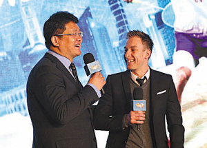 2月28日,前丹麦国手皮特·盖德(右)在启动仪式上与主持人张斌交流。当日,2014羽林争霸红牛城市羽毛球赛启动仪式在北京举行。(新华社发)