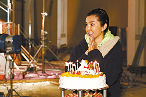 前天,李冰冰首次来到象山影视城,加盟3D魔幻大片《钟馗伏魔:雪妖魔灵》,她在片中饰演外表美艳魅惑、内心备受煎熬的女主角雪妖,将有多种唯美造型亮相。当天正好是她的生日,剧组准备了“飞马”蛋糕为其庆生。图为正在许愿的李冰冰。(南华 陈晓桦)