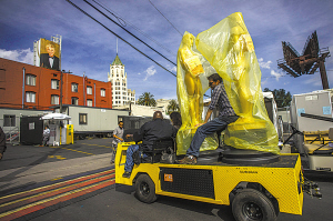 | 2月27日,在美国加利福尼亚州好莱坞杜比剧院外,工人正在运送奥斯卡雕像。(新华社发) |