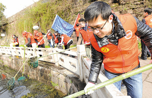 | 昨天上午,镇海团区委70余名青年志愿者正在清理该区林庙路两侧河道垃圾。当天,“小鱼治水·与我同行”———镇海共青团助力“五水共治”专项行动启动。(徐能 计允斌 摄) |