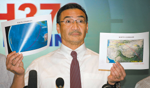 3月17日,在马来西亚吉隆坡国际机场附近的酒店,马来西亚国防部长兼代理交通部长希沙姆丁在新闻发布会上展示客机可能飞往的印度洋北部(右)和南部区域卫星图。当日,马来西亚举行新闻发布会,宣布对客机可能飞往的印度洋南北两个区域的搜索工作已经展开。(新华社发)