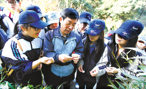 | 邬坤乾在山上为经贸学校学生讲解药用植物。 |