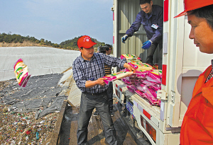 日前,宁波海关将劣质的1000千克大米和500千克面粉在奉化垃圾填埋场进行无害化销毁。据悉,这批粮食是当事人夹藏在其他杂货中,以其他品名申报出口。海关关员截获后抽检认定属于不合格食品。据统计,近3年来,宁波海关共查获走私出口质检不合格的谷物粮食类案件16起,数量达16吨,均依法予以销毁。(胡建华 董楠 摄)