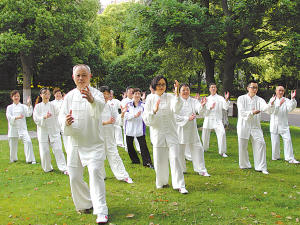 | 队员们在练拳,最前面的为何大爷。(黄丽娟 摄) |