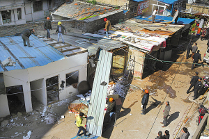 本报讯(记者曹爱方 通讯员蔡晓丰)昨日上午,海曙城管联合月湖街道和区安监、消防等部门,对县学街167号存在严重消防隐患的违法建筑进行了拆除。 海曙城管相关负责人告诉笔者,县学街167号的建筑建于上世纪90年代初期,包括一幢8层的大楼和700余平方米的院子。在十几年的时间里,众多业主在院子里和三楼的平台上搭建了9间违法建筑,导致院子拥挤不堪,存在严重的消防隐患和管理问题。笔者在现场看到,由于违法建筑占据了院子的大部分空间,剩下的通道只够一辆小车通行,一旦遭遇火灾,消防车根本无法驶入。 这些违法建筑有住人的,有用作仓库的,也有用作开花店的,随处可见煤气瓶、包装纸垃圾等。两年前,消防、安监部门曾着手对这一大楼进行整改,却因为触及当时业主们的利益,无人愿意拆除自家的违法建筑,最后这一消防整改事项被搁置。一位居住在大楼里的林师傅说:“这些违法建筑早该拆了,我们等拆违已经等很久了。” 昨天,约600平方米违法建筑被拆除。拆违后,消防部门将对该大楼进行消防改造,以确保安全。