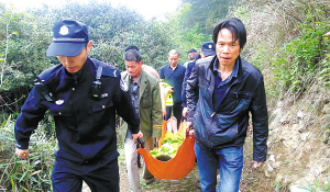 | 救援人员将阿腾抬下山。(俞盛琼 摄) |