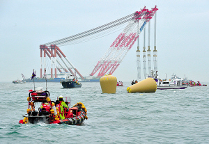 4月18日,在韩国珍岛附近海域,一架巨型海上起重机在标记“岁月”号失事客轮沉没地的浮标附近作业。 (新华社/法新) |
