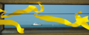 4月24日,在韩国珍岛,祈祷“岁月”号客轮失踪乘客平安返回的黄丝带系在海边护栏上。 (新华社/法新) |