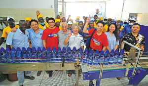 | 图为本报记者在卡拉维市与宁波贝宁国美瓶装饮用水厂员工合影。(严龙 摄) |