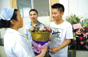 | 6月23日,医护人员献上鲜花祝贺柳艳兵(中)和易政勇(右)出院。(新华社发) |
