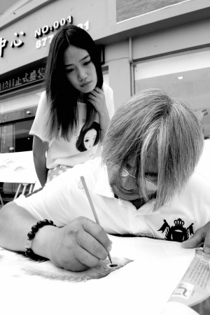 | 图为鱼拓艺术家顾振耀正在为鱼拓点睛。(李岩宏 摄) |