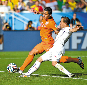 在埃因霍温俱乐部已有上佳表现的荷兰前锋德佩(左)在巴西世界杯上再次证明了自己。生于1994年的德佩在小组赛第二场荷兰队对阵澳大利亚队的比赛中替补登场攻入一球,成为荷兰队世界杯历史上最年轻的射手。小组赛第三场对阵智利队的比赛中,德佩完成了个人在世界杯上的第二粒进球。