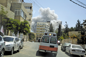 7月27日,在加沙城,一座建筑遭以军空袭后冒烟。(新华社/法新) |