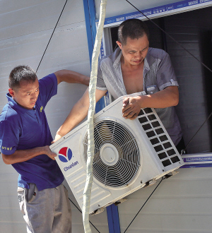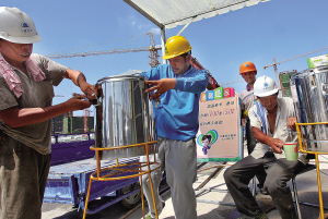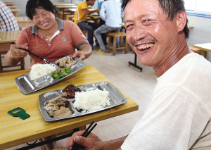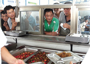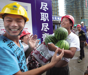 本报讯(胡建华 乐惺惺 沈杰)眼下已是一年中最热的季节。连日来,我们随同市住建委建管处一行,分别到宁波建工、住宅、海达、建设、欣捷、新中源等建设单位工地探营。从现场了解到的情况看,各项目部把做好防暑降温工作、保障施工人员健康放在首位,切实落实“做两头歇中间”高温作息措施。不少工地还给工人宿舍装上了分体式空调,并积极执行卫生洁净化、菜肴多样化等“六化”食堂标准。许多项目部还增加高温期间伙食补贴,让工人们吃得更好、更实惠。 图{1}:海曙安置房项目部施工人员正在免费领取西瓜等慰问物品。 图{2}:东部新城B3-5地块工地项目部为工人宿舍安装了60多台分体式空调。 图{3}:住宅集团江北湾头启动区3号-1地块一期项目部,工地休息亭有专人送茶水。 图{4}:每个项目部工地食堂午餐菜肴品种一般超过10个。 图{5}:在建乐分公司项目部工地食堂,来自河南的木工魏师傅对伙食非常满意。 (胡建华 乐惺惺 沈杰 摄) {2}