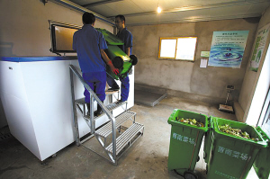 图为工人在向食物垃圾处理机内倒垃圾。 (李祯 摄) |
