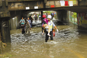 本报讯(记者 王晓峰 通讯员 杨萌萌)受台风“凤凰”影响,昨天早上,鄞州交警大队盛垫中队辖区多处道路出现积水,其中盛莫路铁路道口人、非便道积水情况尤为严重。 由于连续下雨,导致水位上涨,河水倒灌进便道的涵洞里,涵洞内的积水与河面齐平,最深处达80厘米。而作为沟通南北的交通“咽喉”,每天早高峰期间,无数的非机动车以及行人都要通过盛莫路铁路道口。 为此,盛垫交警中队提前在涵洞的南北两端安排了警力,劝导非机动车从青年路—福庆路—环城南路绕行。尽管如此,仍有不少赶时间的市民选择在积水中“冲锋陷阵”。管理这个道口的协警李小力从早上6时开始就在涵洞内蹚着水来回奔波,背着老人和孩子过积水区域。直到11时,他安全护送老人和孩子30多人次,帮助40多位群众将车推出积水区域。