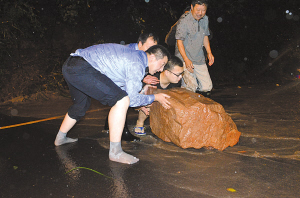 本报讯(记者余建文 通讯员李东雷 朱丹红)前天晚上,台风“凤凰”裹挟风雨来袭,奉化溪口发生局部山体滑坡、石块掉落事故,雪窦山往余姚四明山镇方向的山道上,一块半米多高、重数百公斤的巨石从山上滚落,横亘在路上。 晚上10时许,公安奉化溪口分局的章警官夜巡时,发现了这处险情。这段山路有许多急弯路段,加之雨天路滑,如不及时清理拦路石,将给行车安全带来严重威胁。 章警官立即打开警灯,现场指挥交通,并通知相关部门排险通路。公安溪口分局立即组织人手赶来,与当地村干部一起,冒着山体随时可能再次滑坡的危险,蹚入泥水中,先把路面上的碎石清理干净,接着大伙合力将巨石推至路边,并在醒目处放置了警戒牌,保障道路正常通行。