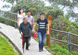 昨天下午,一个小伙子搀扶着奶奶,祖孙三代同游四明山地质公园。 (记者 李岩宏 摄) |