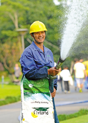 ▲昨天下午,绿荫市政园林的叶师傅在鄞州公园灌溉树木。