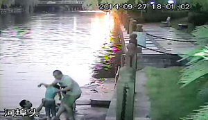 图为救人现场,两个好心人合力将小琳救上岸。 (视频监控截图) |