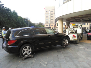 交警拆下套牌奔驰的车牌。 套牌车被拖车拖走。 (余建文 摄) |