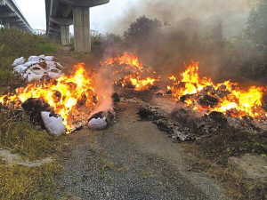 前天凌晨,北仑城管执法大队小港中队接群众举报,称有人在小港渡头董村绕城高速公路高架桥下焚烧垃圾。值班的执法队员马上前往查看,发现现场有3大堆类似纺织废料的垃圾正在燃烧,火苗蹿起有1米多高,刺鼻的怪味令人难以忍受。而且随着风势,大火正逐步向四周蔓延开来,很快就要危及到上方的一根高压电线。滚滚浓烟也给高速公路上行驶的车辆造成了严重影响,存在较大的安全隐患。城管队员立即采取措施灭火,同时向消防部门报警。很快,两辆消防车赶到现场,一阵大水喷淋,大火被迅速扑灭。目前城管部门正在追查相关责任人。 (冯小平/文 陈荔/摄)
