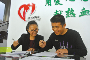 | 夫妻俩献血前一起填写登记表。(冯小平 摄) |