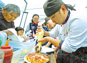 昨天上午,市民正在文化广场观赏西点师制作点心。当天,第八届宁波美食节举行“大厨教你来做菜”活动,大厨们亮绝活,传手艺,与市民分享美味制作心得。