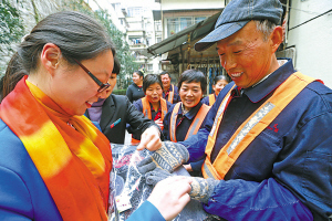 “天气冷了,你们要多注意保暖啊”。昨天下午,江东区东胜街道张斌社区组织两新党员给辖区内的环卫工人送去手套、毛衣等御寒物品,让他们在工作时多一些温暖。