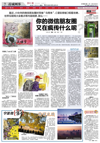 天猫宝,“hold住”太难 相信酣战“双十一”的剁手党中,不少人都对“天猫宝好存,想花不容易”深有体会。既能“收利息”又能“抽红包”的天猫宝,存时看着好处多多,等到要花时可真是难上加难。不少网友被约束繁多的天猫宝折腾得心灰意冷,纷纷在微信朋友圈里吐槽“累觉不爱”。 备战“双十一”期间,天猫宝单笔充值满300元就能获得一次抽红包机会,对这笔实惠动了心的网友李小姐迅速存了1500元进去:“我早就帮男朋友看好了一双名牌休闲鞋,反正到时也要花这笔钱,现在存钱还能抽红包,这种好事怎能错过?”没想到当她顺利下单后,天猫宝里的钱却付不出去,这令李小姐彻底傻了眼,“后来仔细看了天猫宝规则才知道,不是所有天猫商品能以天猫宝形式支付的。结果红包没捞到,天猫宝里的钱还成了摆设,简直太坑爹了!” 用天猫宝买东西遇到的烦恼还不止这些。网友“Chris”购买了几条牛仔裤后,天猫宝中还剩余218元,这让她不禁感到“心塞”:“其实我还想买两盒粉底,要900多元。但是天猫宝的余额不够支付订单时,就不能直接使用了,哪怕差几毛钱都不能支付。”没辙的“Chris”只能继续往天猫宝里充了700多元,才顺利将宝贝买了下来。天猫宝的重重门槛让网友“阿肥”也大费了一番脑筋,为了用掉100多元的余额,他只能勉强买了几样不需要的东西:“否则转出还要交1%的手续费,那也太不划算了。”这还不是最郁闷的,“双十一”过后,他发现天猫店好多商品涨价了,但为了凑单也只能忍了:“你说我好好的信用卡不用,非要往里面砸钱,操作过程还那么繁琐,感觉自己被忽悠了!” “双十一”狂欢过后余波未平 “双十一”网购已经过去,可571亿销售额引发的效应,一时半会儿根本停不下来。败家太多夫妻闹矛盾等新闻屡见不鲜;“蜀黍”在为“买东西买到手软,收快递收到腿软”的童鞋,卖萌支招如何安全收包裹;各大小区门卫里三层外三层,满满地被堆成仓库……还有各种吐槽在朋友圈发酵。 这两天,一组名为“双十一奇葩买家秀分分钟雷倒人”的图片在微信上疯转。想象中的宝贝与现实中的不同,卖家“高大上”的照片展示与“不忍直视”的买家秀之间的落差,让网友们纷纷表示已经醉了:真正的高级黑,让卖家彻底哭瞎;为诸多买家果断清空购物车提供有效参考! “虽说这组照片是恶搞成分占多,但其实也反映出一个问题———实物与图片存在差异!”甬城网友“红包包”看完这组图结合亲身经历说,“网购有风险,入手需谨慎!”“双十一”当天,她在网上买了一件酒红色的外套,到了手里之后这件衣服却变成了玫红色。“这颜色明显不对啊!”穿上刚收到的衣服,“红包包”一阵“哀嚎”,“除了颜色差异极大之外,衣服的毛领、纽扣也明显和图片上不一样。”她说,在卖家的展示图中,这款衣服的领子是纯色的,到手里的这件衣领却是花斑纹的。网友“角落”自称已看透淘宝的真谛:买东西不能光看卖家秀,很多衣服穿在模特身上和普通女孩身上的效果是两回事。更何况淘宝卖家一般还会修图! 网购狂欢落下大幕,当剁手族们仍沉浸在购物快感之中时,一则10位快递员自曝收入的消息迅速上了微博热门话题榜。根据入行时间,10名快递员月收入少则3000元,多则近万元。看完快递员收入后,不少网友惊呼并调侃道:这收入秒杀上班族们,赶紧转行做快递员!双“十一”甬城快件量超1700万件,作为完成网上购物“最后一公里”的践行者的快递小哥,自然也备受关注。“我们赚的都是辛苦钱,因为客户不理解挨骂;起早贪黑常年无休;一日三餐没有固定时间等算是家常便饭。”今年双十一这段时间,网友李师傅说几乎每天早上5:30就开始忙了,有时甚至一直要到凌晨2:00左右才能歇息。“白天吃饭都需要挤时间,5分钟就得搞定,饭后也顾不上休息还得继续派件。”不过,他说等工资发到手的时候还是觉得挺高兴的。 网友“KITE”是网购达人,她说经常看到小区快递小哥的包裹里,装着红牛、士力架、充电宝等物品。“快递员一到节假日越忙,不管刮风下雨,天气如何恶劣,都要走街串巷,爬楼入户,不论是工作时间,工作环境,还是劳动的强度,都在那摆着,不是任何人都能承受的。” “物理渣”的你,看懂《星际穿越》了吗 “不要温顺地走进那个良夜,老年应当在日暮时燃烧咆哮;怒斥,怒斥光明的消逝。”这几天,狄兰·托马斯的《不要温顺地走进那个良夜》火了。网友“橙子”表示,这首诗在他微信朋友圈里出现的频率几乎达到了“刷屏”的态势:“朋友们看完《星际穿越》后一股脑地在分享这首诗,都评价它是点睛之作,”这让本就是诗歌迷的他十分兴奋,“台词的确精彩,从害怕死亡,到勇敢地面对死亡、对抗死亡,这首诗完美地体现了穿越队伍前往土星前的心境转变。” 克里斯托弗·诺兰的科幻新作《星际穿越》,让物理迷和“三体”粉们彻底地过了把“极客”瘾。刚看完电影的网友“雀鸟”感觉自己经历了一场“眼界大开”的太空旅程:“首先是震撼,再次是惊叹,最后是感动。这不是科幻片,这不是太空片,而是旷世巨作,这才叫史诗!”网友“summer”也毫不吝惜溢美之词:“我想给100颗星!这可能是我至今看过最震撼的电影了!诺兰大神把我的世界观如此震撼人心地展现出来,我现在都快激动得语无伦次了。”酣畅淋漓的观影体验迅速引来了各方好评,观众们纷纷表示“尿没有白