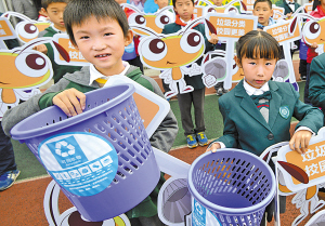 为更好地普及校园垃圾分类和环保节能知识,市生活垃圾分类管理办公室把一批可回收垃圾专用桶和有害垃圾专用桶送进江北实验小学。 (胡建华 范奕齐 摄) |