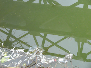 | 毒死的大鱼已被捞走,河面上仍漂浮着大量小的死鱼。(通讯员 提供) |