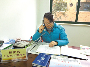 | 图为朱红春正在电话回访就业居民。(黄琼 摄) |
