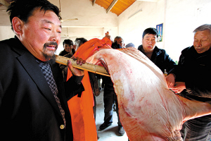 昨天,奉化市大堰镇竹林村村民周位军(左一)宰了两头家养的大肥猪送到镇敬老院,同时还送去了年糕和高山米。周位军说,他在高山上养了家猪,种了生态米,收入不错,过年了让敬老院60多位老人吃得好,吃得开心,也实现了他多年的一个心愿。