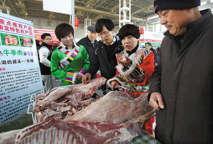 | 图为在市年货展上,我市对口支援的青海天骏县展出的高原有机牛农产品受到市民的追捧。(胡建华 胡颉然 摄) |